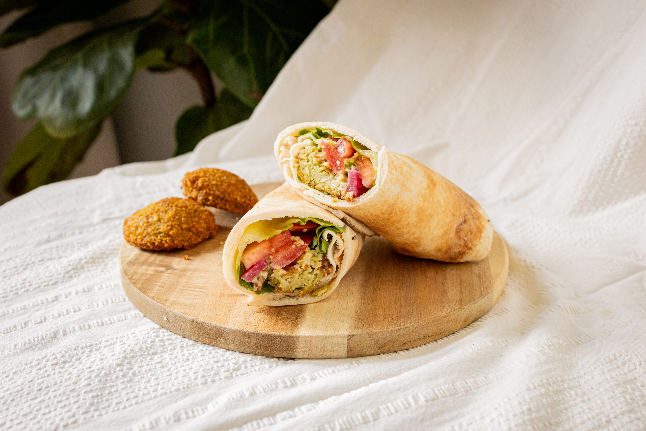 Ingredients (Wrap): Pita Bread, Falafel, Lettuce, Tomato, Pickle, Tarator (Tahini, Garlic, Lemon Juice, Water, Salt)