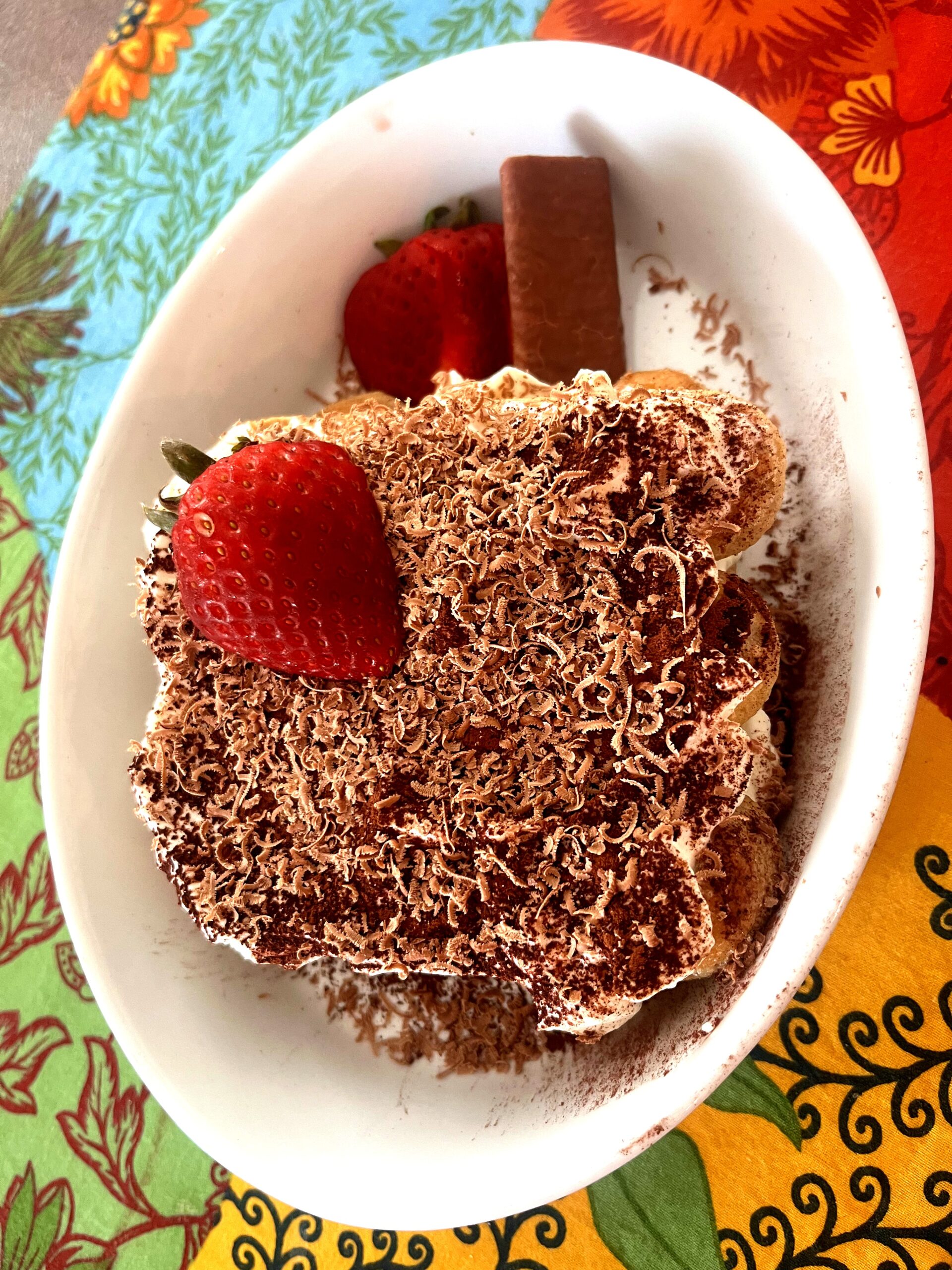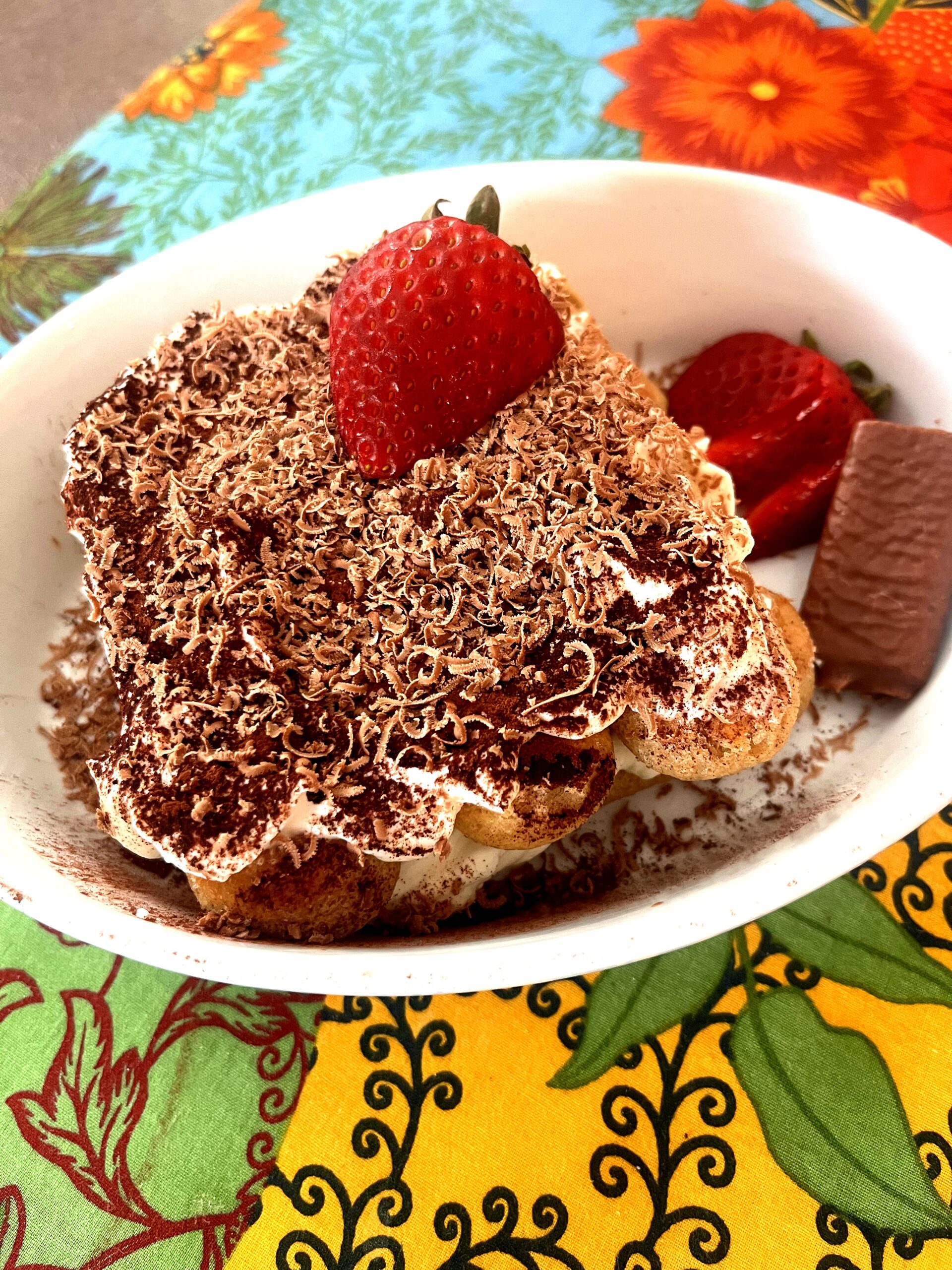 Ingredients: Lady fingers, coffee, touch of liquor, whipping cream, sugar, vanilla extract, cocoa powder, mascarpone cheese.