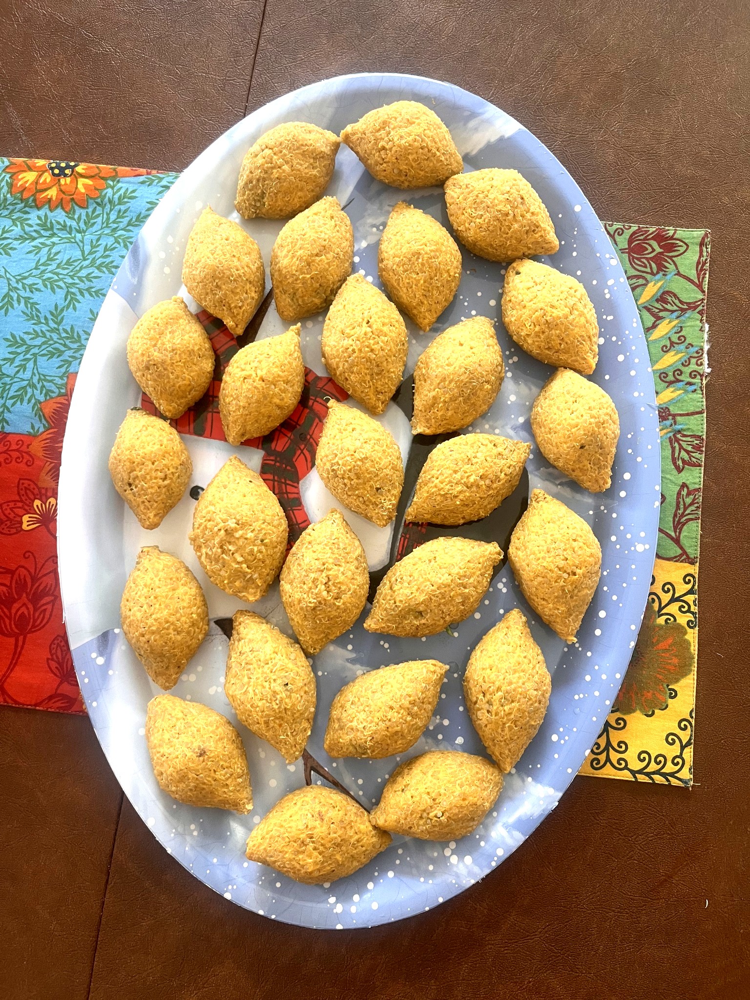 Our vegan fried kibbeh bites are made with a gluten-free dough of quinoa, pumpkin paste, flour, and Middle Eastern spices. Inside, they’re filled with a hearty mix of sautéed spinach, onions, chickpeas, turmeric, sumac, and olive oil. Hand-shaped into cone bites and fried until perfectly crisp, each piece offers a warm, flavorful bite that’s completely plant-based and gluten-free by default. Choose between 2-bite and 3-bite sizes—great for appetizers, party platters, or mezze spreads.